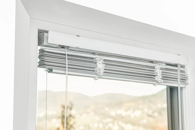 Seitenansicht der invasiven 25 mm Aluminiumjalousie im Licht der Scheibe.