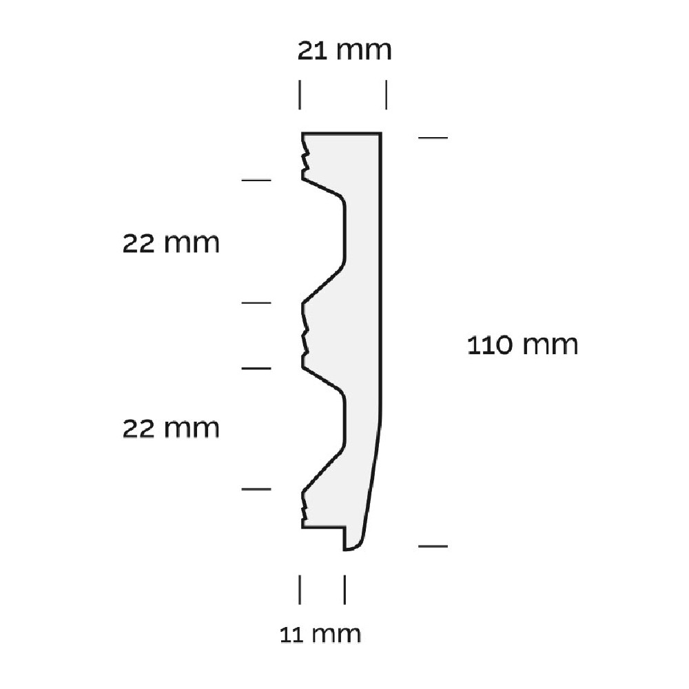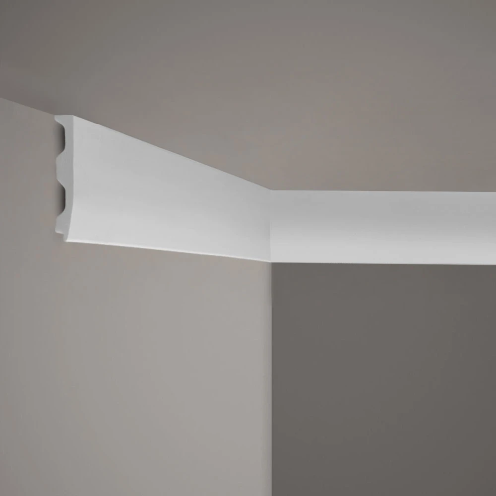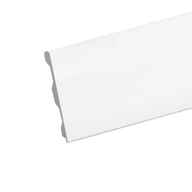 - Eine Sockelleiste aus strapazierfähigem Polyurethan, das eine hohe Widerstandsfähigkeit und Langlebigkeit garantiert. Sie ist eine ausgezeichnete Wahl, die den Produkten aus Polystyrol, das zu Rissen neigt, überlegen ist.