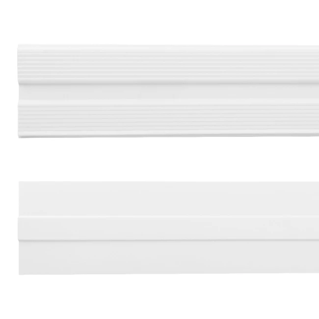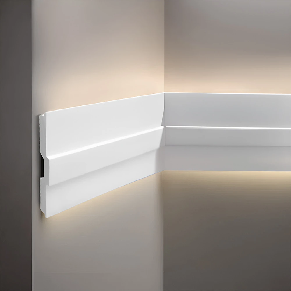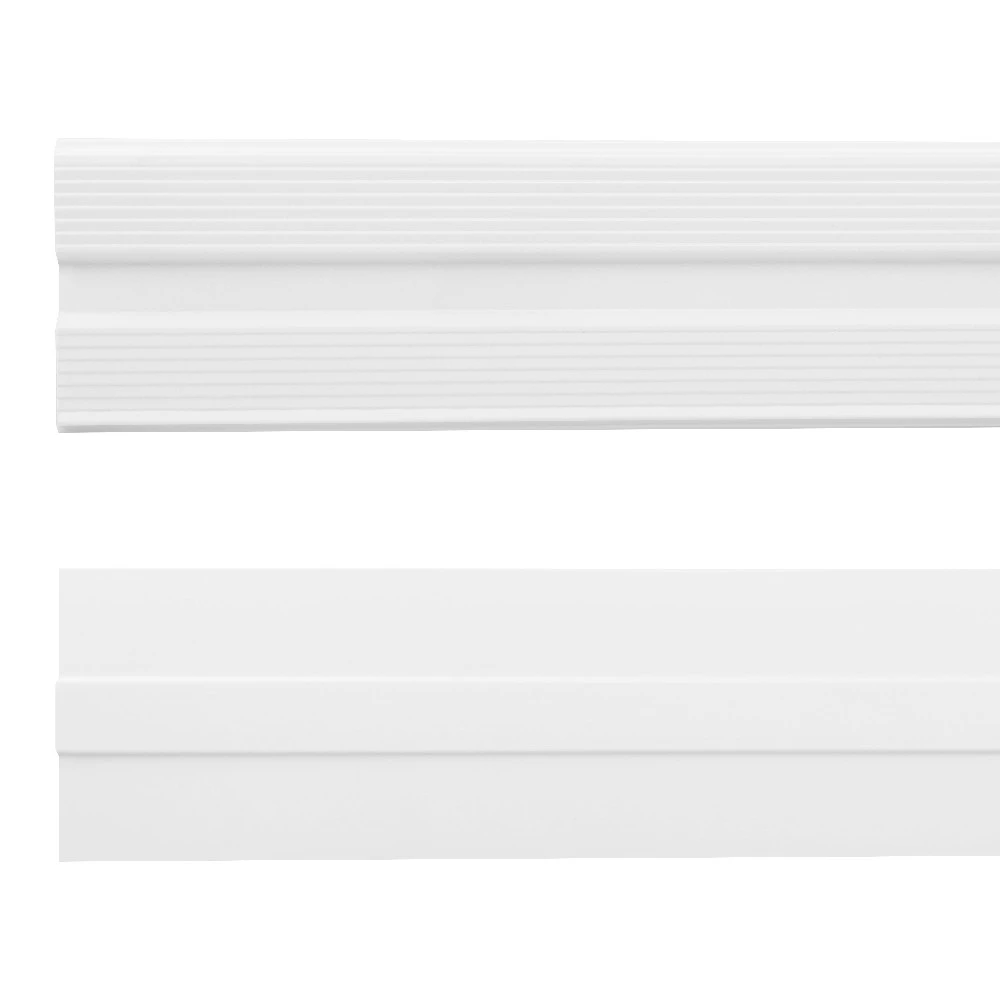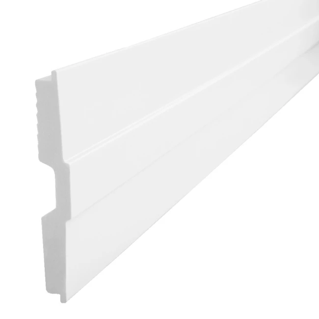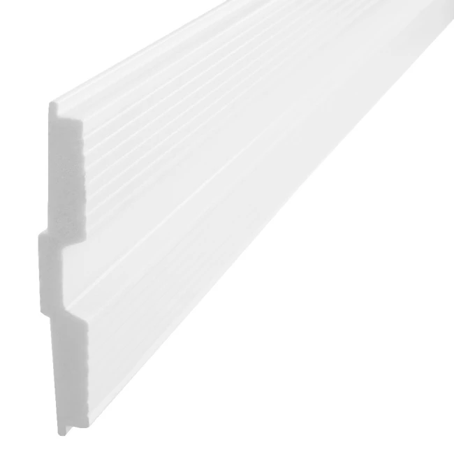 - Eine Wandleisten aus strapazierfähigem Polyurethan, das eine hohe Widerstandsfähigkeit und Langlebigkeit garantiert. Es ist eine ausgezeichnete Wahl, die den Produkten aus Polystyrol, das zu Rissen neigt, überlegen ist.