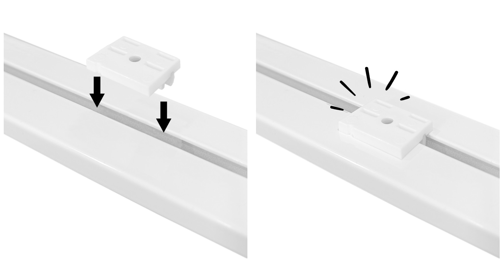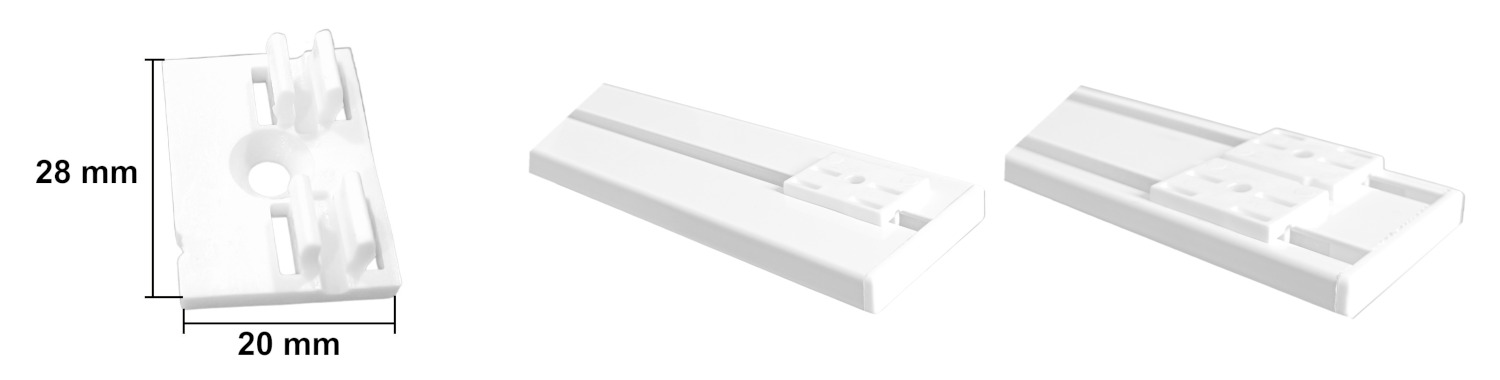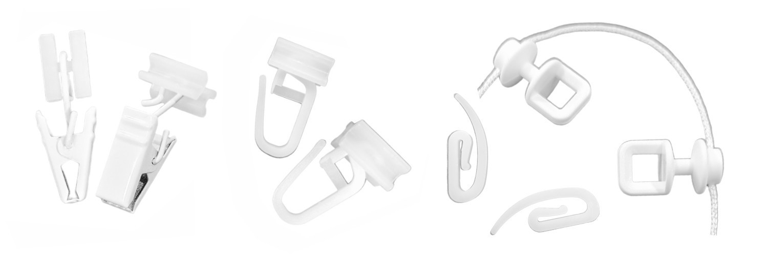 Standardbefestigung. Auf der Innenseite der Klammer befinden sich Zähne, die das Verrutschen der Vorhänge verhindern. Vorgesehen, um direkt am Vorhang und an dem in den Vorhang eingenähten Faltenband zu befestigen. Menge: 2 Stück alle 10 cm (z.B. für eine 200 cm lange Schiene werden 40 Stück Aufsteckung mitgeliefert).