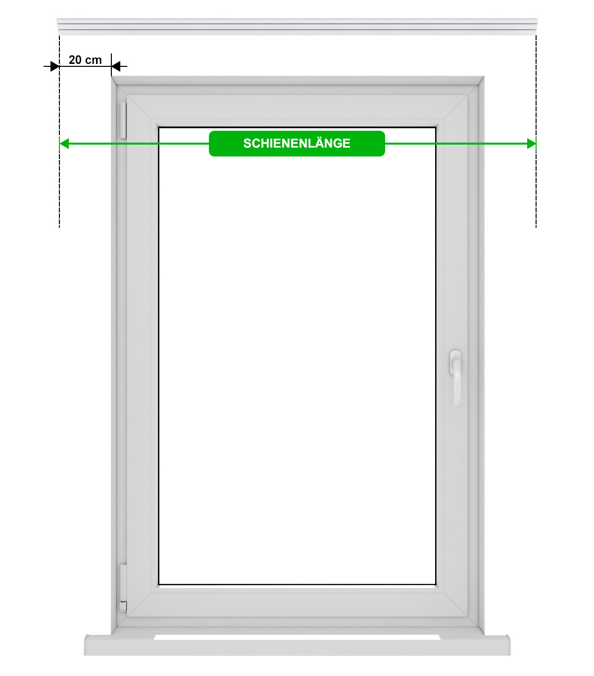 Um die passende Länge der Schiene zu wählen, wird empfohlen, dass sie mindestens 40 cm (20 cm auf jeder Seite) breiter als die Fensternische ist.