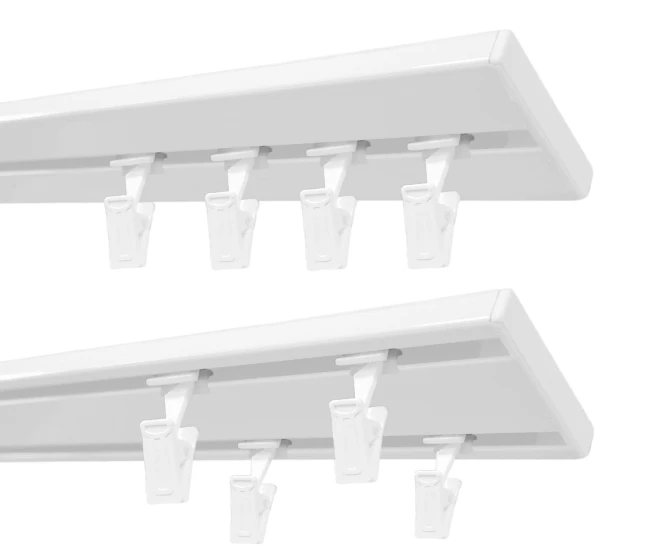 - Die Aluminium-Duoschiene besticht nicht nur durch ihre Ästhetik, sondern auch durch ihre Praktikabilität. Ihr flaches Design macht sie fast unsichtbar und lenkt die Aufmerksamkeit auf die Fensterdekoration selbst.