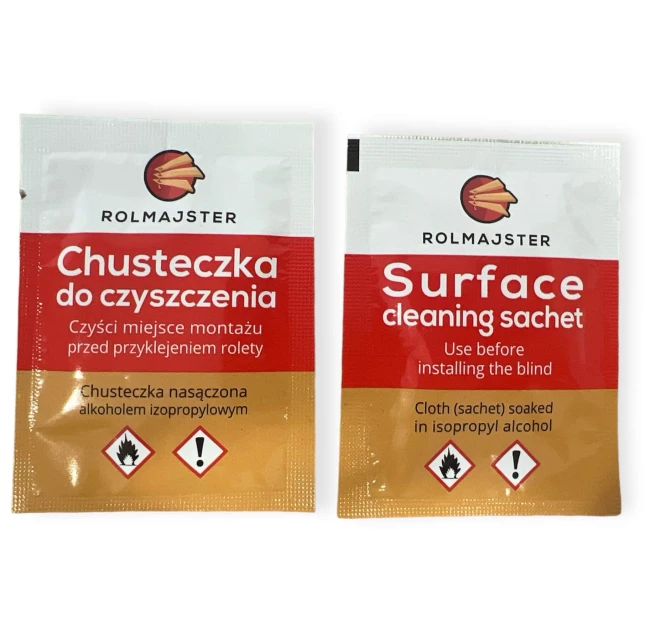 - Das im Beutel enthaltene Tuch zur Reinigung der Montagestelle der Bänder enthält ein Tuch aus staubfreiem Viskose-Polyester-Vliesstoff, das mit Isopropylalkohol getränkt ist.