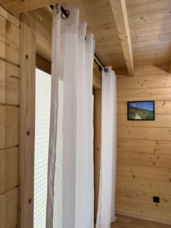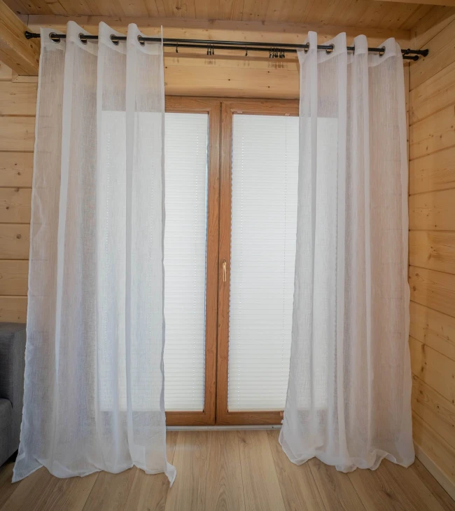 Die Gardine in einem schneeweißen Farbton aus mattem Ethamin mit Regen-Effekt genäht. Das dickere, dicht gewebte Material sieht wunderschön aus, schirmt das Fenster dezent ab und schützt den Innenraum vor zu viel Sonnenlicht.