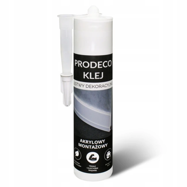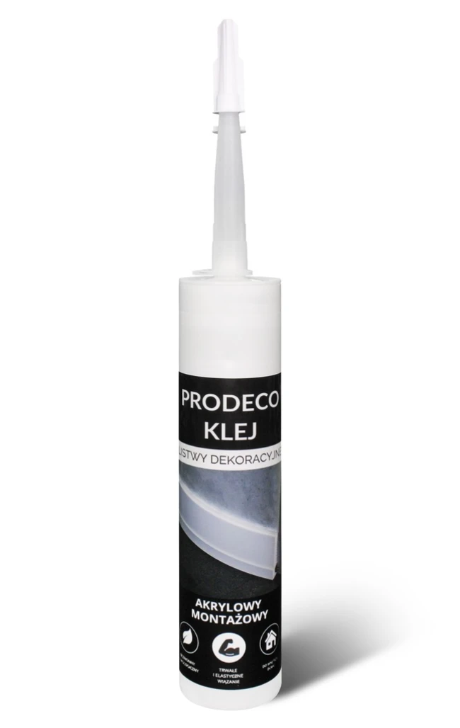 Achtung: Der PRODECO-Kleber ist kein Kontaktkleber – die Aushärtungszeit ist verlängert, daher wird beim Anbringen von Deckenleisten empfohlen, diese bis zur vollständigen Aushärtung des Klebers abzustützen.