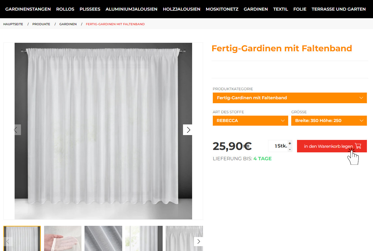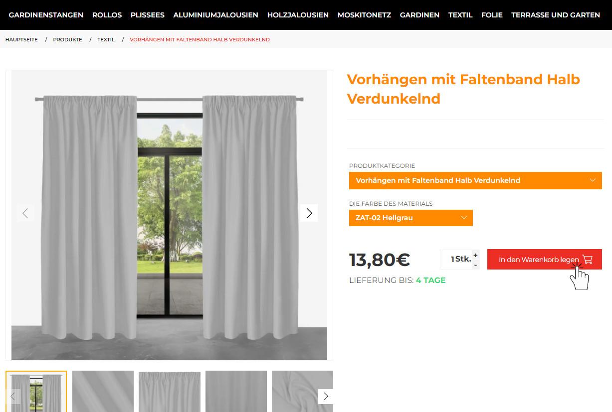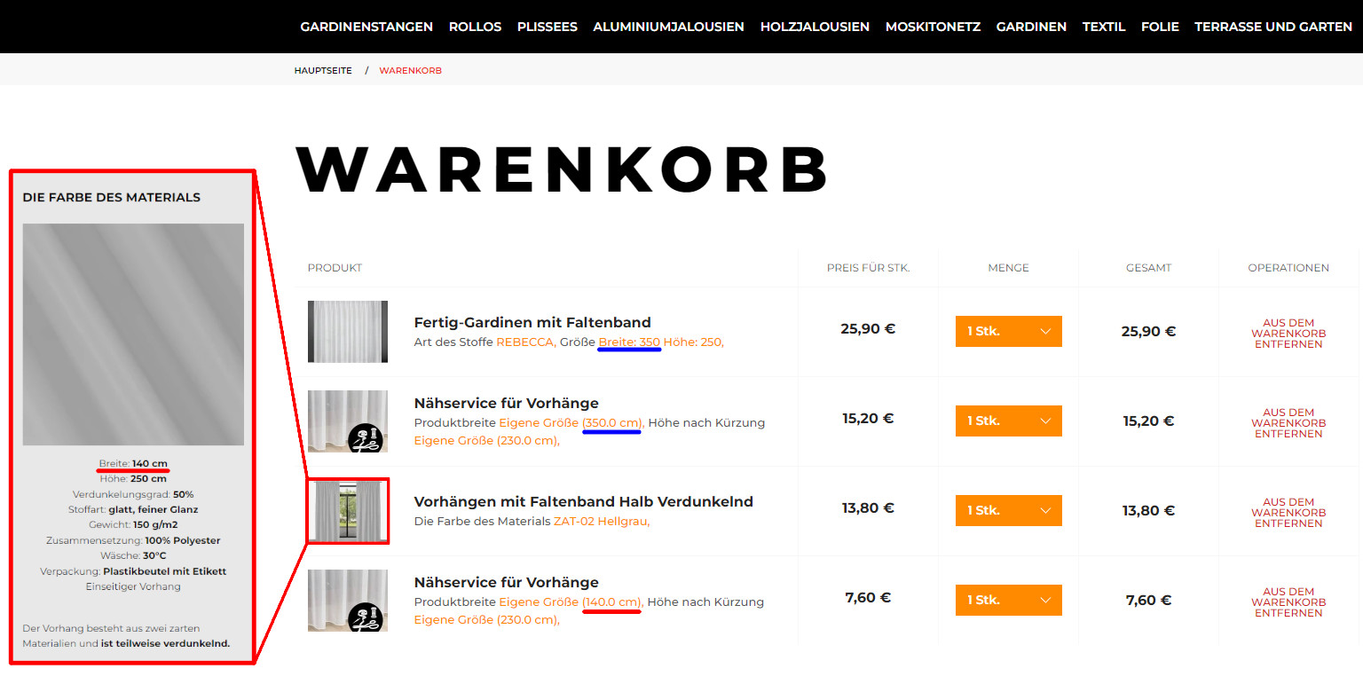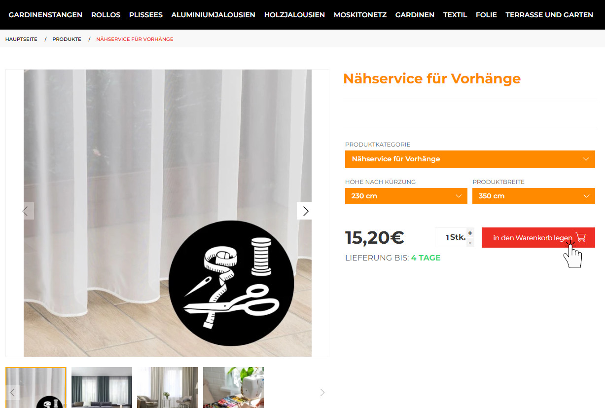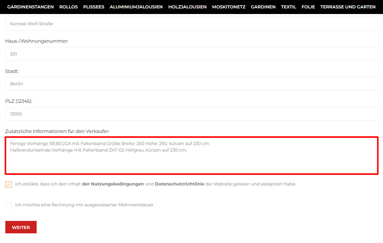 4. Geben Sie in den zusätzlichen Informationen für den Verkäufer an, welche Gardine / welchen Vorhang wir für Sie kürzen sollen und um wie viel, wenn Sie mehrere Produkte bestellt haben.