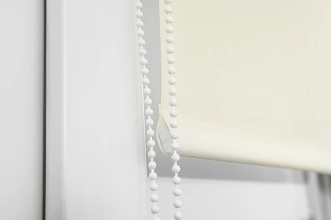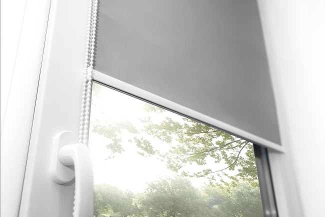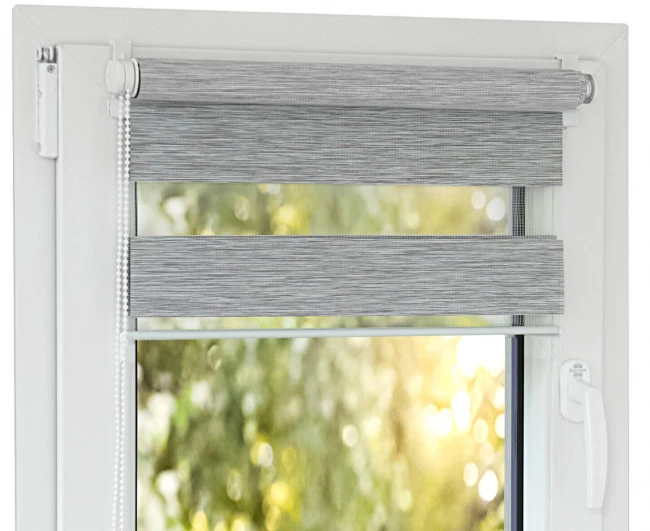 Seitenansicht eines Mini-Rollos mit Seitenverspannung und anderen Materialien als Tag-Nacht.