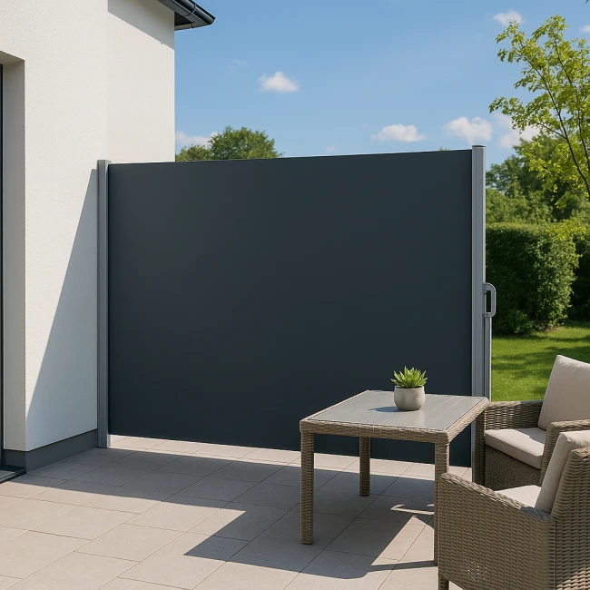 - Unsere Seitenmarkise besteht aus einem besonders dicht gewebten Stoff, der effektiv verdunkelt und vollen Komfort und Schutz vor intensiver Sonneneinstrahlung garantiert.