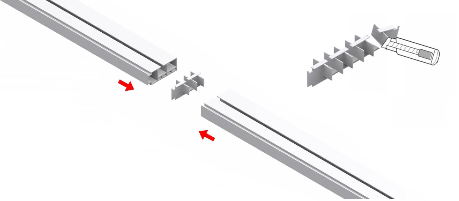 Der Verbinder wird einzeln an die 1-läufige und 2-läufige Schiene geschnitten und an die 3-läufige wird komplett angenommen: